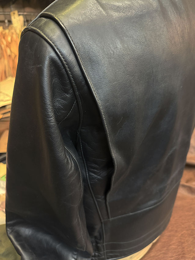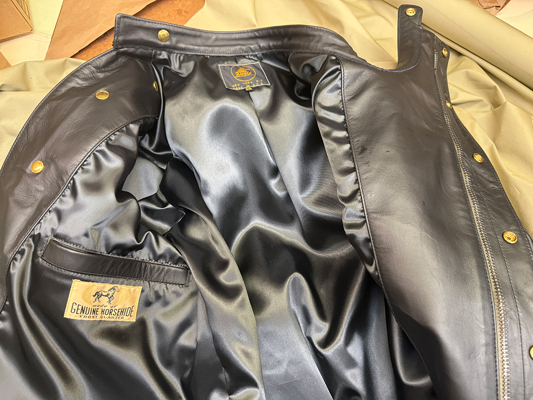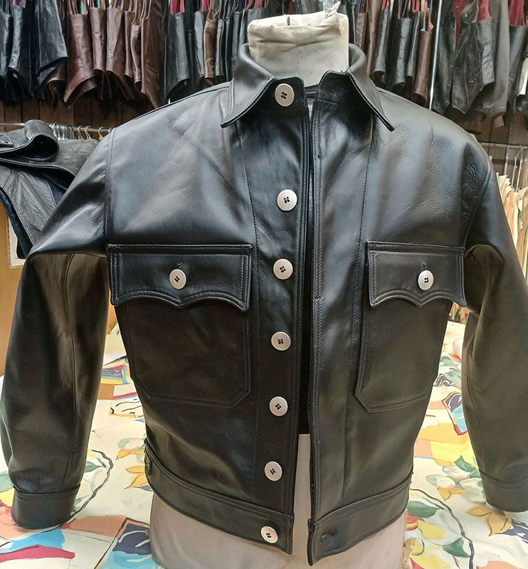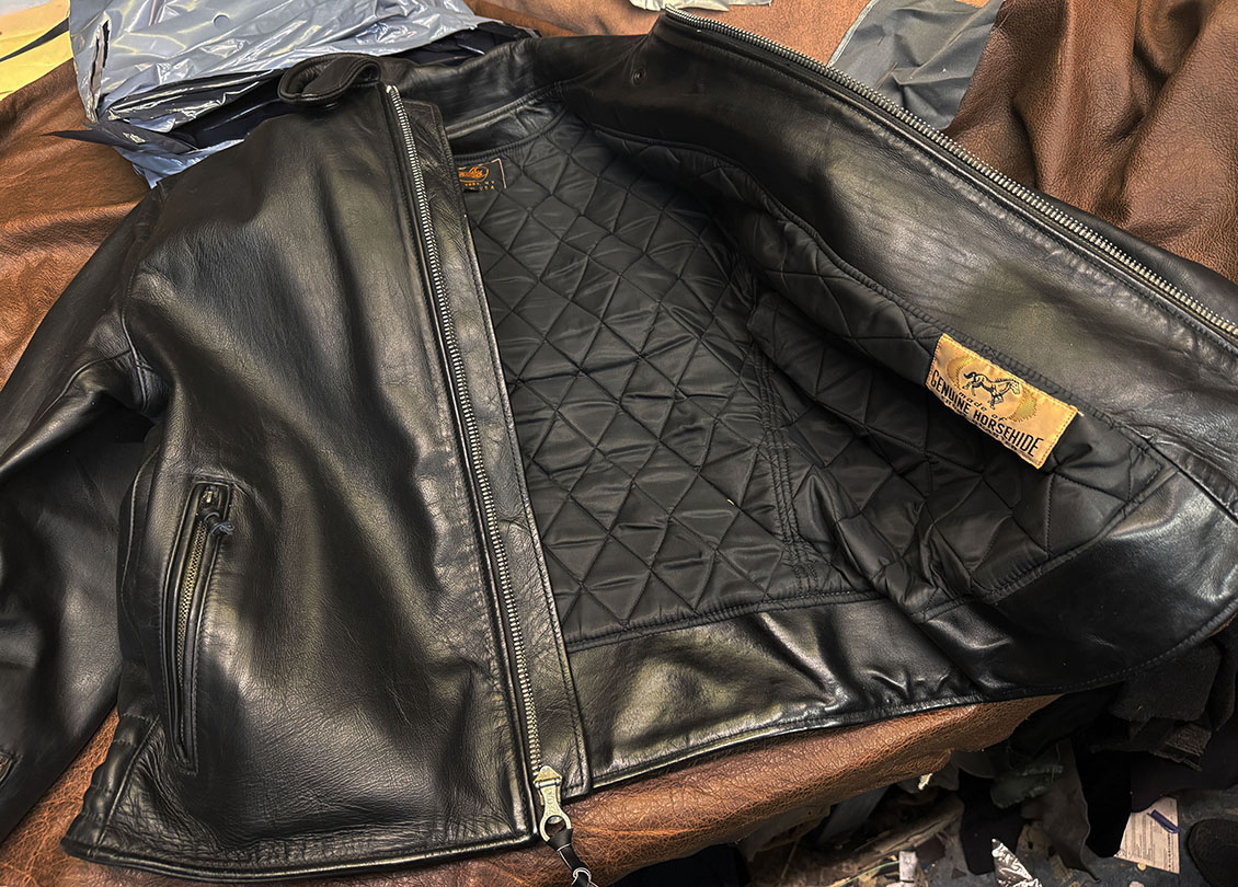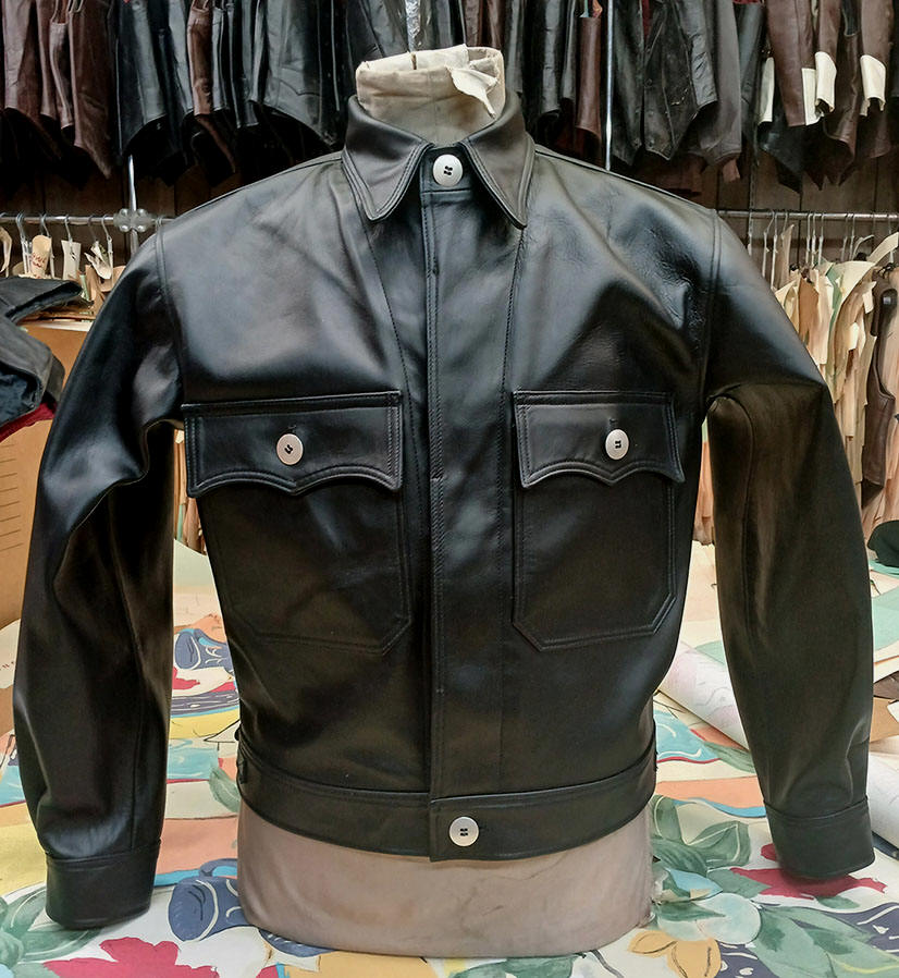 0063 LEATHERTOGS 'A' AS NEW 4 OZ. BLACK HORSEHIDE BROWN 1940s N.O.S. RAYON LINING CUSTOM BLACK-ON-BLACK HARDWARE 42R REG. 2450.00 SALE 1750.00 SOLD |