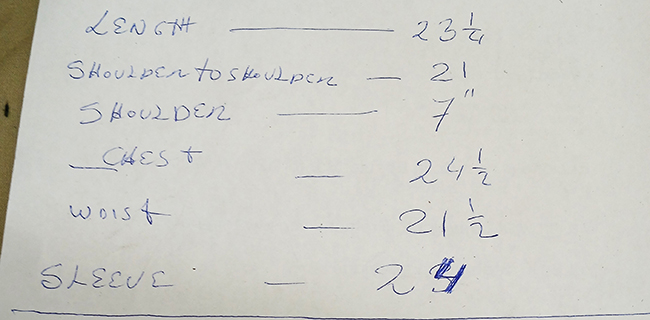 ![]() MEASUREMENTS: SHOULDER: 21.5" SHOULDER SEAM: 7.0" LENGTH: 24.75" ARMPIT: 23.0"
