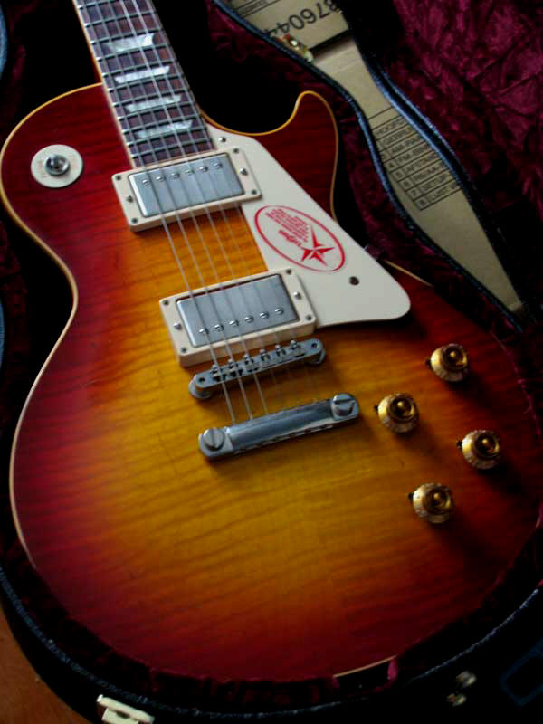 2009 GIBSON HISTORIC DIVISION 1959 LES PAUL STANDARD FLAMETOP #991395. MINT $5650.00 CHERRY SUNBURST STUNNING EASTERN ROCK MAPLE RIBBON FLAME WITH CHARACTERISTIC FLECKS. PERFECT 1959 AUTHENTIC DEEP CHERRY SUNBURST. ALL ORIGINAL. |