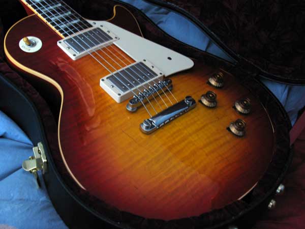 In the many guitars I've collected since the 1960s, authenticity has been the mainstay, in originals, then reissues. I owned and was enthralled by originals when young and always sought pristine, non-wannabe examples. I've also owned ten Gibson Historic Division Custom Shop Les Pauls and only selected those Gold Tops and Sunbursts with accurate, unfaded, undoctored finishes. But the bean counters at Gibson always respond to customer preference, however dimwitted, so doctored, faded, aged finishes are the norm. But every so often Gibson will turn out an accurate, correct, mind-blowing top, and this is one! Eastern Hard Rock Maple is esteemed for its density and tone. Most Custom Shop examples are Michigan Maple, which differ in grain and, it is said, tone. The fantastic flame on this gem speaks for itself. Condition is Mint with vague use tarnishing on metal parts. All the original goodies: BurstBuckers, Bumble Bee caps, Extended Tenon. Original Custom Shop case. |