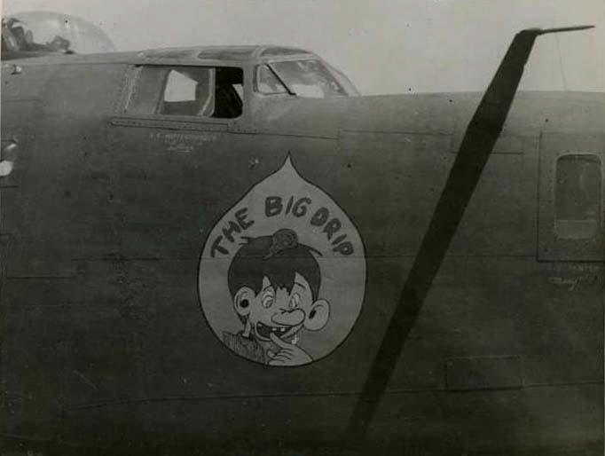 comic caricature artwork. THE BIG DRIP was a B-24 from the 8th Air Force. The worried