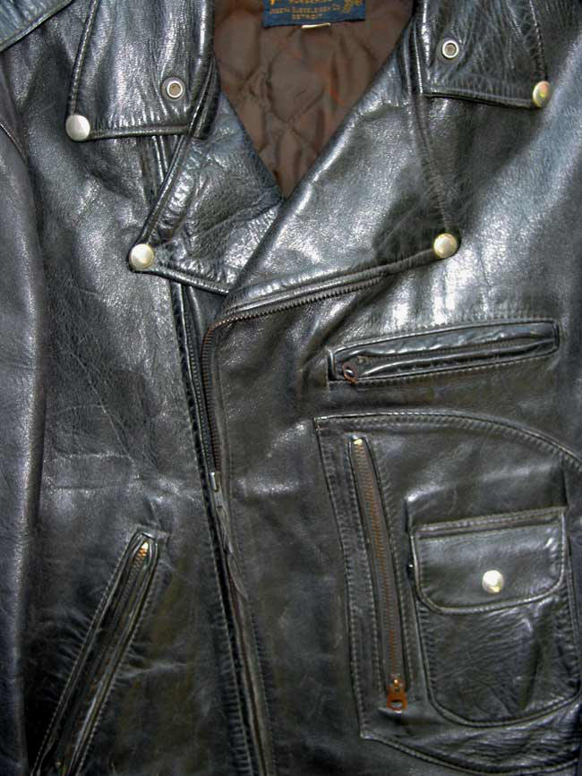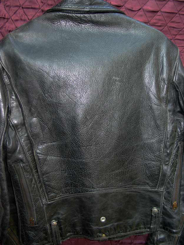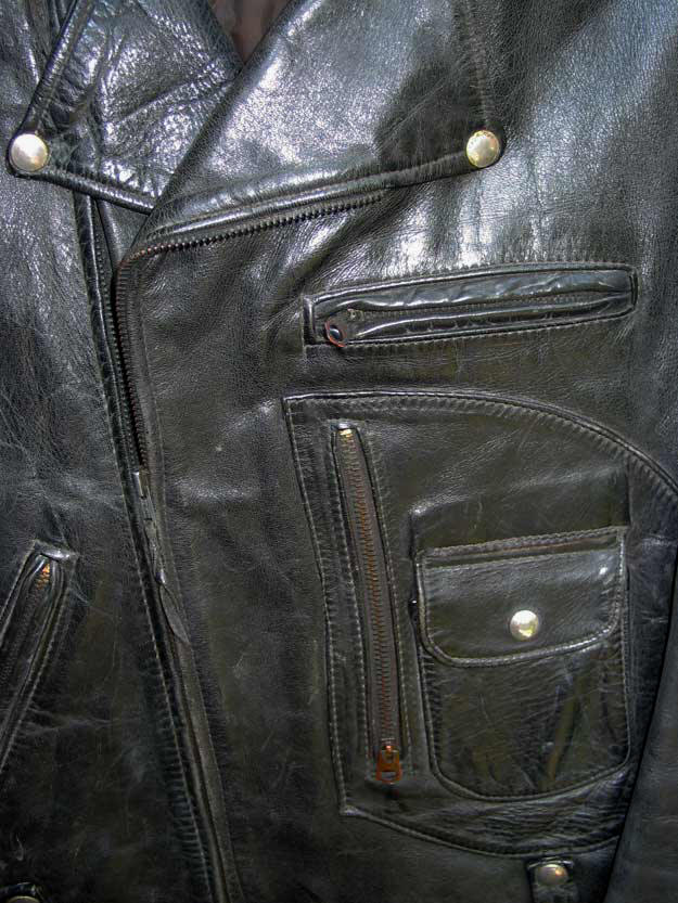 A near mint condition BUCO J24 from the Joseph Buegeleisen Co. of Detroit. The Horsehide construction places it before the 1960s, when Steerhide examples prevail as Horsehide became harder and harder to obtain. The workmanship, materials and design exemplify what for collectors is the Golden Age of true motorcycle jackets, as opposed to the generic cowhide cheapos abundant today. The LOST WORLDS BUCO J23 and J24 are faithful, perfect recreations of this most sought after classic Motorcycle Jacket., using 4+ oz. chrome-tanned Black Horsehide that equals in quality and exceeds originals in weight.