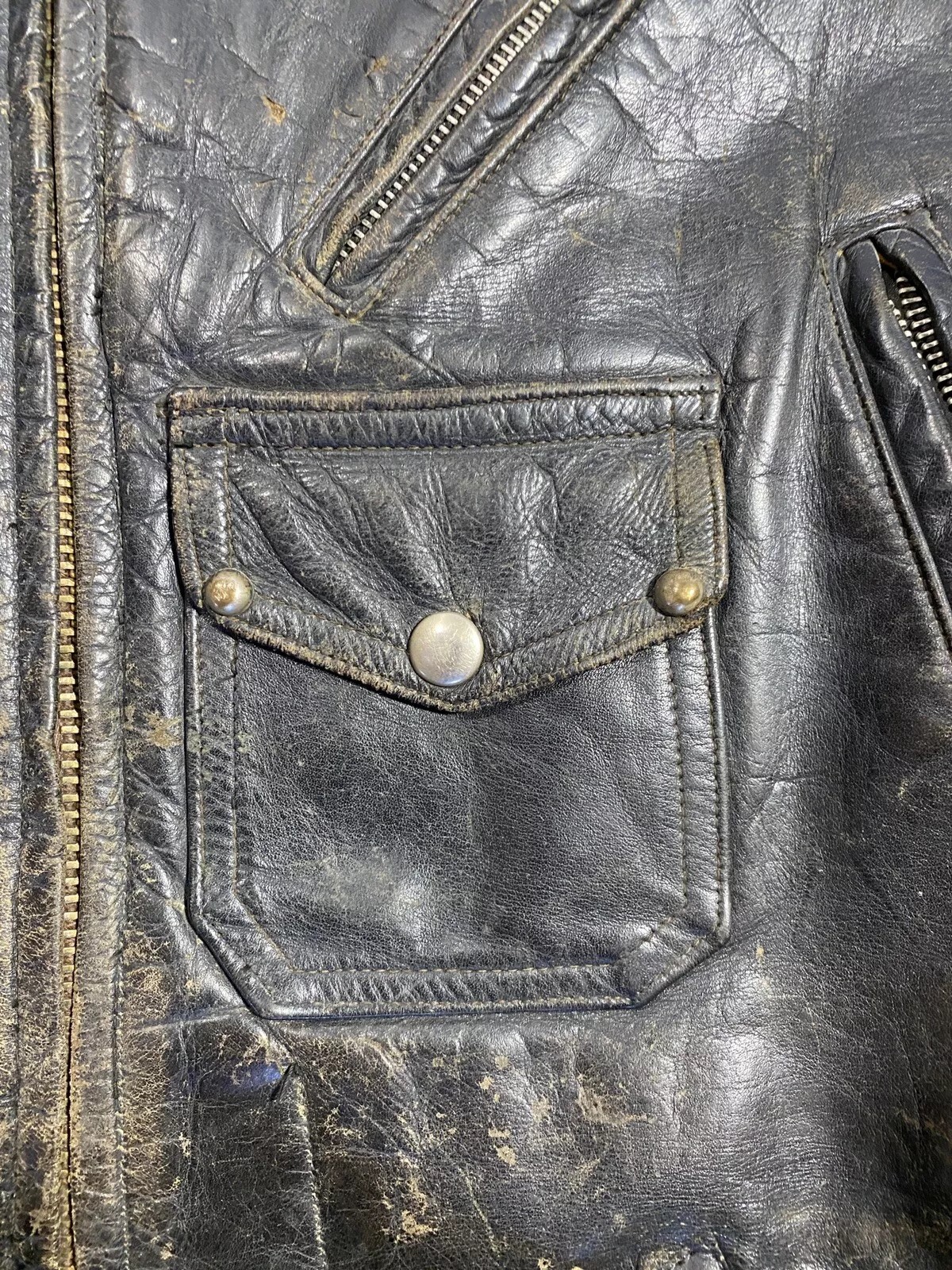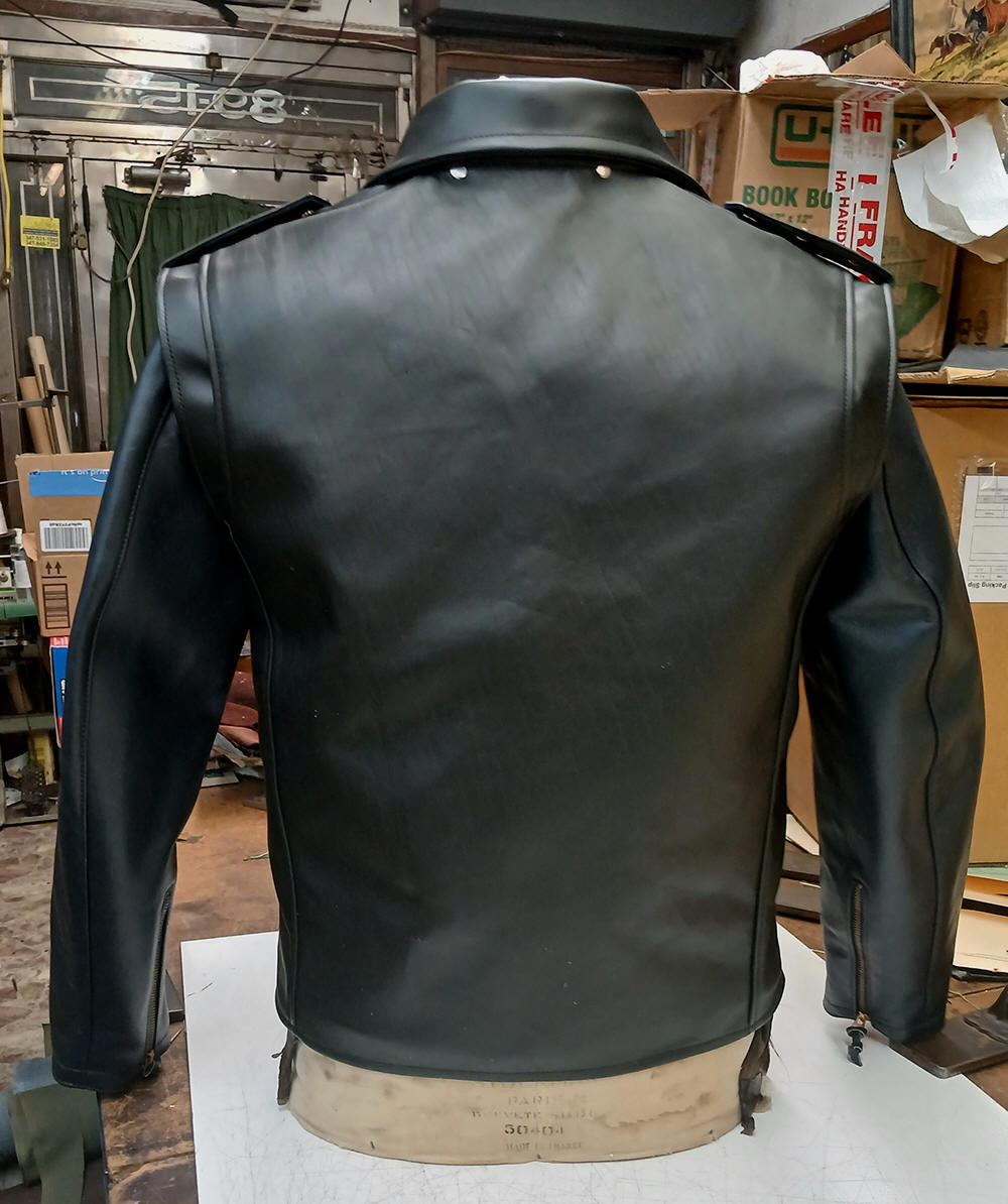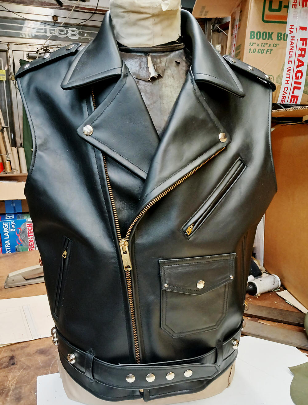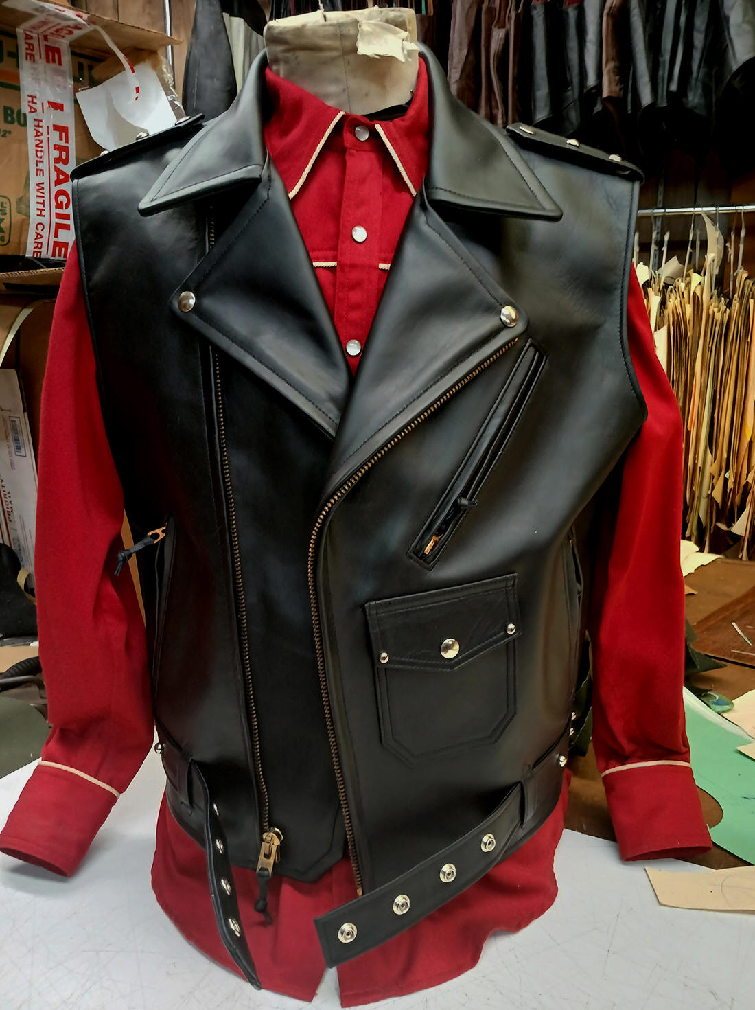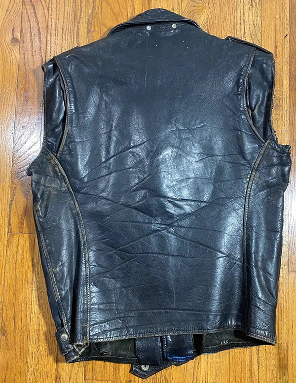 A new addition to our matchless line of Vintage American motorcycle outerwear. Combining true riding functionality with gritty, no-nonsense masculine look. And increased flexibility and rider friendliness. Starting in the 1950s guys began to cut off the sleeves and linings of their leather jackets in hotter climates and to extend jacket use to four seasons everywhere else. The result became an attitude icon on the screen and street. ERGO -- 'HOG MASTER' Unlined, Sleeveless -- You supply the rest: vest, sweatshirt, denim trucker,T-shirt, jacket, nada -- your call. The resulting Lost Worlds image and projection isn't vacant Punk Rock but kickass insouciant Bryan Ferry Hip. And first and foremost motorcycle-serious. Cool macho. Attached adjustable frontal Belt, studded and snapped. No metal buckle. More minimalist vibe, less weight and contact worn loose or open. Ultra-cool profile that upgrades the classic 1950s 'Brando' look with revised layout and a great riveted 'Lighter' pocket. Heirloom LOST WORLDS American workmanship and materials. Superior riding and rain protection. Legendary durability and natural, untampered Horsehide grain. 3.0 - 4.5 OZ. AMERICAN PROPRIETARY LOST WORLDS HORSEHIDE (CUSTOMER CHOICE). BISWING BACK WITH CONTOUR SIDE PANELS. NOS BRASS US MILITARY TALON OR SCOVILL ZIPPERS. NICKEL NECK CHAIN. 18 OZ. CANVAS POCKETS. ![]() 'Just wanted to let you know I’ve been enjoying the Hog Master immensely- it’s become one of my favorite pieces of gear! Always such a pleasure purchasing and using your amazing products' AW 8.25 SLEEVELESS 0081 HORSEHIDE OVER 0031 SUBURBAN HORSEHIDE ![]() ![]() ![]() HOG MASTER w/ BUCO J25 JACKET ![]() ![]() ![]() ![]() ![]() ![]()