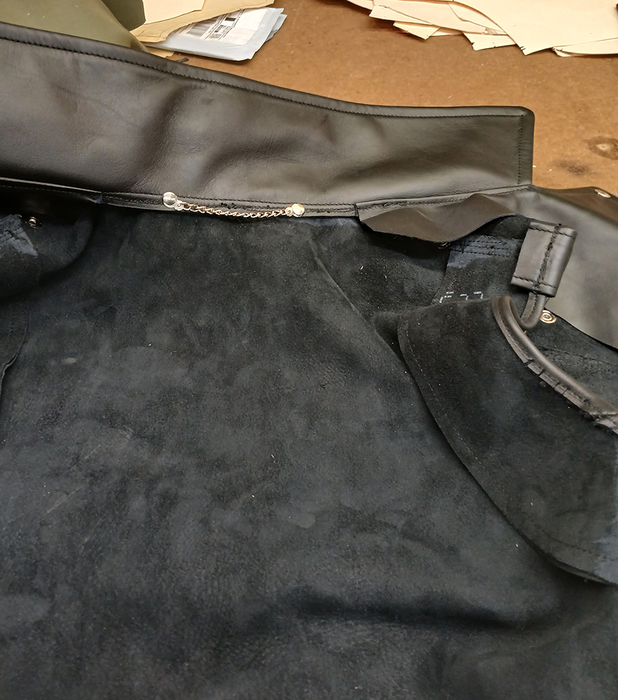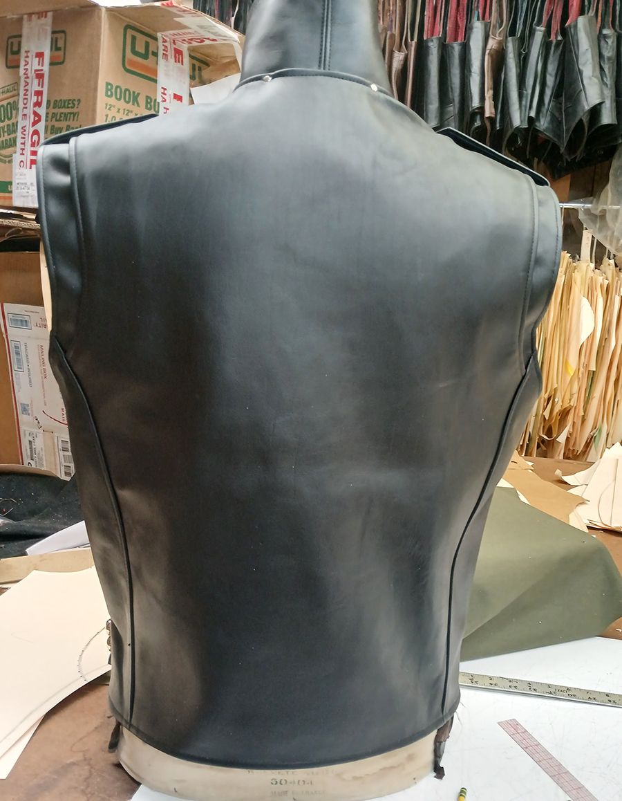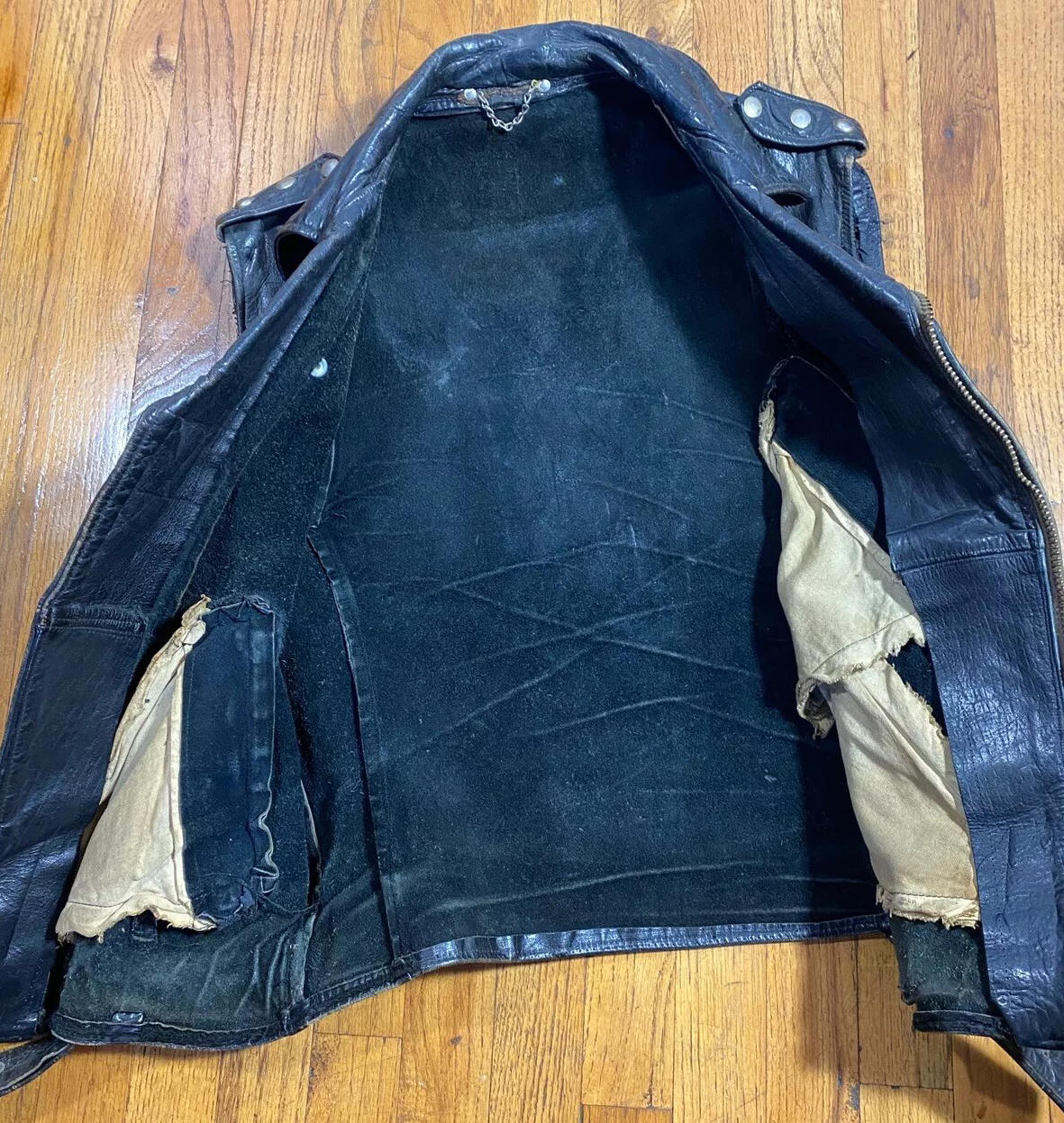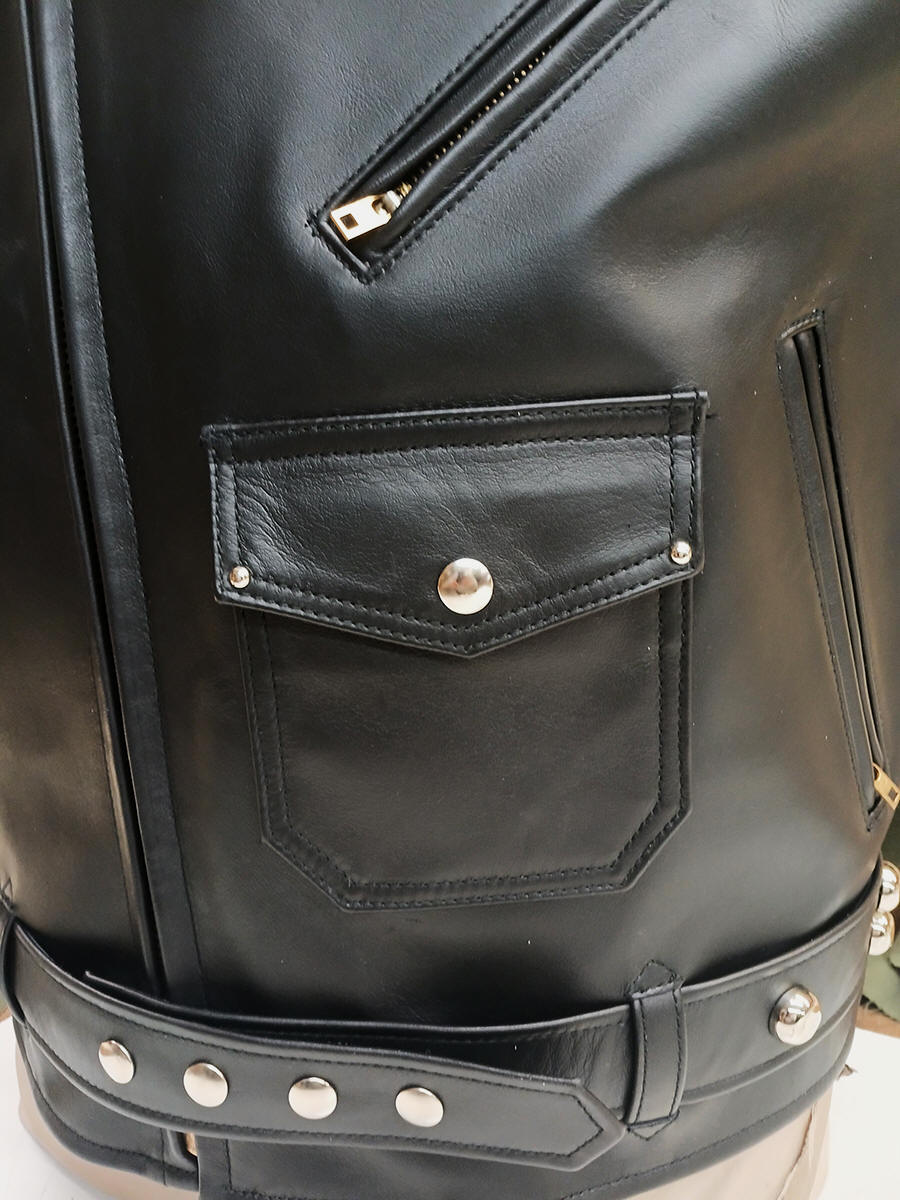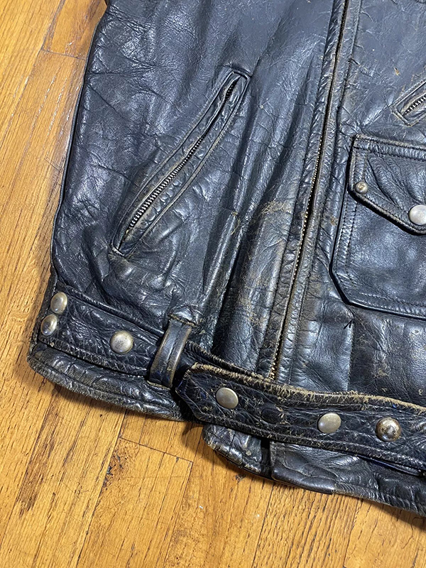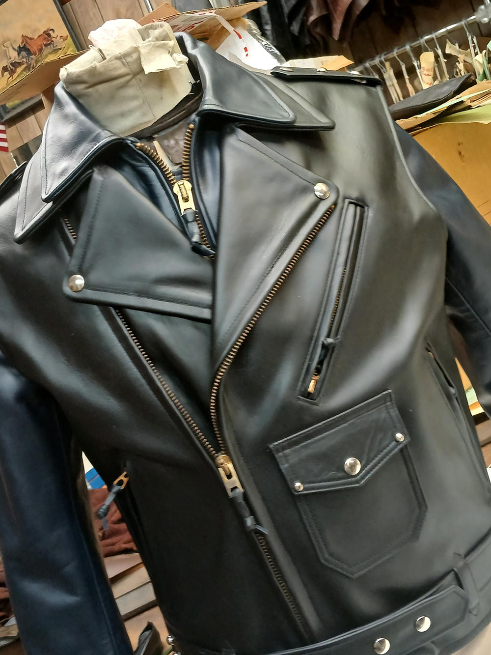 A new addition to our matchless line of Vintage American motorcycle outerwear. Combining true riding functionality with gritty, no-nonsense masculine look. And increased flexibility and rider friendliness. Starting in the 1950s guys began to cut off the sleeves and linings of their leather jackets in hotter climates and to extend jacket use to four seasons everywhere else. The result became an attitude icon on the screen and street. ERGO -- 'HOG MASTER' Unlined, Sleeveless -- You supply the rest: vest, sweatshirt, denim trucker,T-shirt, jacket, nada -- your call. The resulting Lost Worlds image and projection isn't vacant Punk Rock but kickass insouciant Bryan Ferry Hip. And first and foremost motorcycle-serious. Cool macho. Attached adjustable frontal Belt, studded and snapped. No metal buckle. More minimalist vibe, less weight and contact worn loose or open. Ultra-cool profile that upgrades the classic 1950s 'Brando' look with revised layout and a great riveted 'Lighter' pocket. Heirloom LOST WORLDS American workmanship and materials. Superior riding and rain protection. Legendary durability and natural, untampered Horsehide grain. 3.0 - 4.5 OZ. AMERICAN PROPRIETARY LOST WORLDS HORSEHIDE (CUSTOMER CHOICE). BISWING BACK WITH CONTOUR SIDE PANELS. NOS BRASS US MILITARY TALON OR SCOVILL ZIPPERS. NICKEL NECK CHAIN. 18 OZ. CANVAS POCKETS. ![]() 'Just wanted to let you know I’ve been enjoying the Hog Master immensely- it’s become one of my favorite pieces of gear! Always such a pleasure purchasing and using your amazing products' AW 8.25 SLEEVELESS 0081 HORSEHIDE OVER 0031 SUBURBAN HORSEHIDE ![]() ![]() ![]() HOG MASTER w/ BUCO J25 JACKET ![]() ![]() ![]() ![]() ![]() ![]()