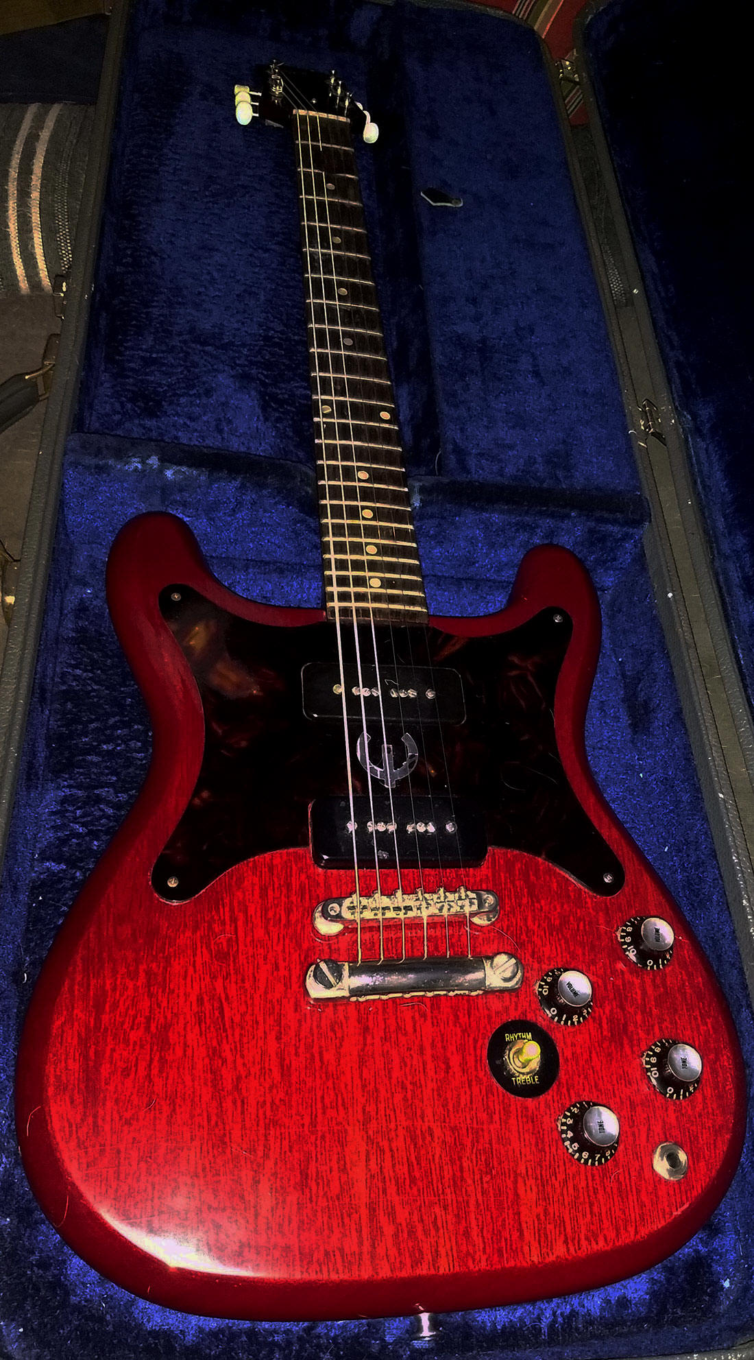 As collectors know, Gibson purchased the esteemed NY Epiphone company in 1958 and began producing Epiphones alongside Gibsons in the Kalamazoo factory to cultivate new dealers in areas already with Gibson dealerships. Epis were in no way poor sisters of Gibson but unique models of often higher specification than the better known Gibsons. The rare 1960-62 Wilshire solid body featured components from the 1956-60 Les Paul Standard and Custom that equipped no other Gibson solid body. Additionally, Gibson introduced components in Epiphones unavailable in its own line like the superb Mini Humbucking pickup and Trem-O-Tone Vibrato, as on this very special guitar. Epis were always made in fewer quantities than Gibson so the scarcity factor adds to a general lack of knowledge of these great guitars. And ups the coolness factor -- in the laughable wannabe world of collectability, Epis would double in value overnight if, say, Eric Clapton appeared with one. Jimi Hendrix, Johnny Winter, Steve Marriot, Wayne Kramer are but a few of the notables who played Epi solid bodies. The hollow and semi-hollow models were used by the likes of Keith Richard, John Lennon and Robbie Robertson, to name but several. ![]() |