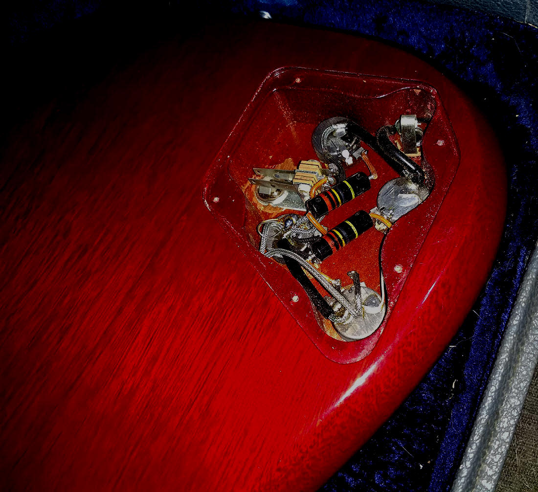 ![]() Note: White "marks" are hairs from sheepskin storage "cocoon." not blems. Lighter area to left of pickguard horn reflections from guitar polish. |