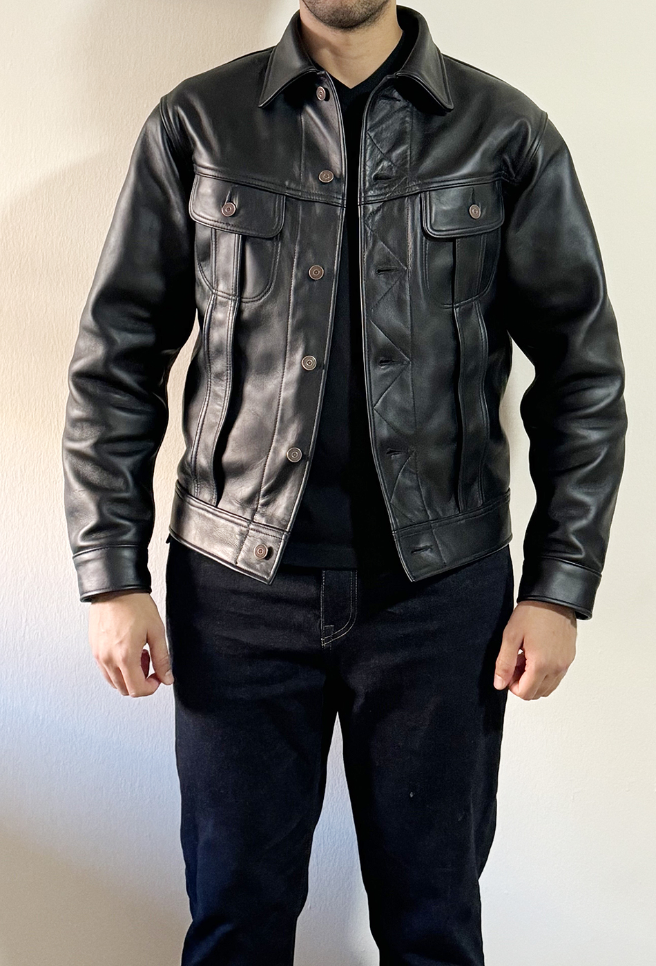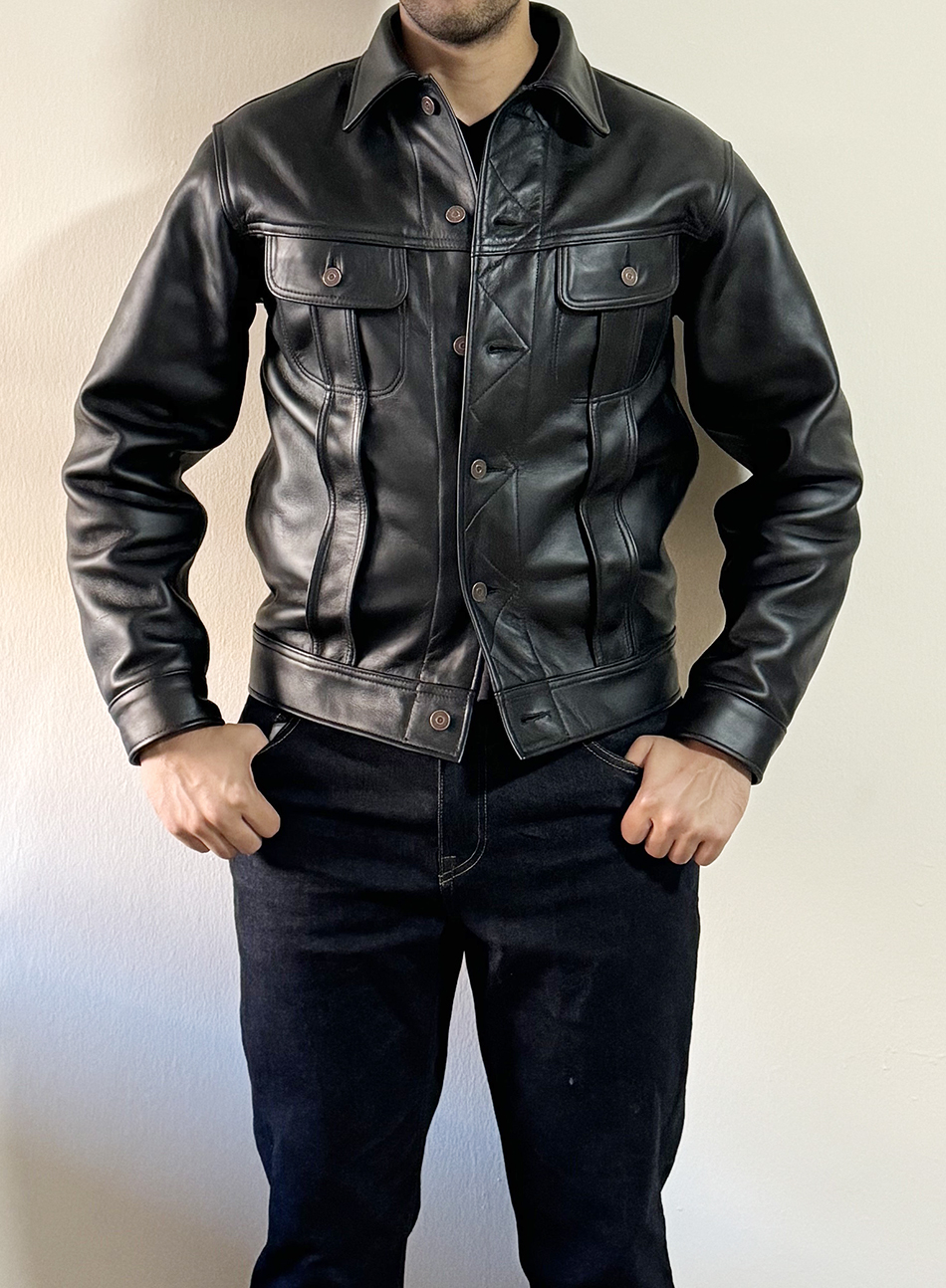 The Lost Worlds Vintage Horsehide Trucker Jeans Jacket. A tribute, emulation and idealization of an All-American Riding and Roping Classic. Fitted and trim. Eye-catching on the bike or on the street. Timeless.